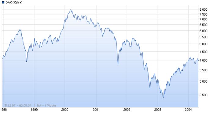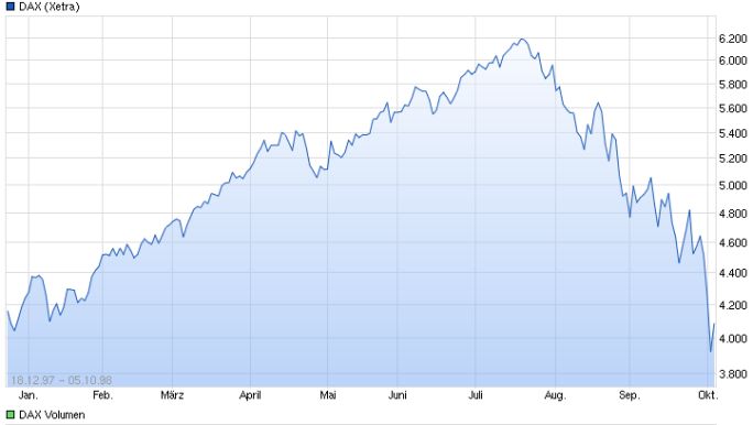 Lag der Dax noch 1995 bei knapp 2.000 Punkten so stand er 2 Jahre später Ende 1997 bei 4.000 Punkten. Aber alleine 7 Monate später stand der DAX erstmals bei 6.200 Punkten und was passierte. Richtig es knallte. Und der Dax fiel innerhalb von 3 Monaten auf 4.000 Punkte zurück. Schuld daran war die LTCM Blase.
