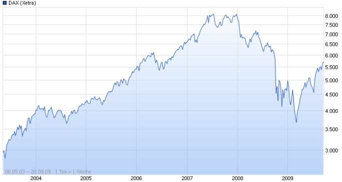 Der Hype auch als DotCom-Blase bezeichnet erreichte 2003 ihren Tiefpunkt und liess eine neue Blase entstehen. Und der Grundgedanke war schonmal nicht schlecht. Jetzt hatte man 5 Jahre 2 Blasenbildungen überlebt und der Dax war gerade einmal um 500 Punkte die letzten 8 Jahre geklettert. Also wird nicht mehr so viel in Aktien investiert, jetzt investieren wir in Immobilien und die Gewinne in neue überteuerte Immobilien und die Gewinne aus den Kreditzinsen der Immobilien investieren die Banken in Aktien und in Fantasiepapiere den sogenannten Derivaten. Und schon haben wir einen neuen Hype.