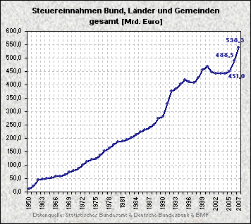 Und hier kommen jetzt die Staaten zu ihren Schuldenrollen. Der Staat begreift seine Schulden als Investition in die Zukunft. Der Staat investiert, die Wirtschaft brummt und alle haben Einkommen, zahlen Steuern und der Staat kann mit den höheren Steuereinnahmen die Kredite tilgen. Hier ein Bild der Steuereinnahmen bis 2007, die dieses Bild bestätigen.